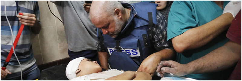 半島電視臺記者瓦埃爾•達杜(Wael Al Dahdouh)抱著遭以軍空襲的兒子。達杜的妻子、兒子、女兒、孫子都在此次空襲中身亡。