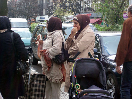 艾倫'烏莎爾是德國出生的土耳其姑娘﹐我在1999年第一見到她。 她說﹐父親和母親都希望她這一代成為真正的德國人。 她說﹕“我母親從土耳其移民到德國的時候﹐心裡不安﹐她把在家鄉常戴的蓋頭丟棄在飛機上了﹐擔心蓋頭會給她帶來麻煩。” 今天﹐步行在柏林市內紐克恩(Neu-Koln)和克魯茲堡(Kreuzberg)這兩個居民社區﹐立即感覺到了某個穆斯林國家﹐街上行走的女子大多數都戴著蓋頭﹐有老人﹐也有年青人。 她們沒有把蓋頭丟棄在家鄉﹐或飛機上﹐她們在德國建立了自己的新家鄉。 她們與土耳其中部安納托利亞老家居民不一樣﹐那裡的女人都戴著傳統的方巾﹐土法紡織的厚棉布﹐而德國的穆斯林女子的蓋頭實行全球一體化﹐輕薄的細紗﹐色彩鮮艷﹐她們所表現的形像﹐不是土耳其人﹐而是國際化的穆斯林女子。 在柏林市中心大街上﹐十年來﹐戴蓋頭的女子數量猛增﹐甚至有些年青女子穿最保守的伊斯蘭寬敞長袍﹐蓋頭之前又加上一條面紗﹐只露出一雙美麗的大眼睛。