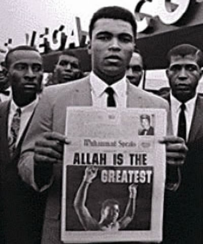 圖片:1964年2月25日,美國年輕的拳擊手卡休斯·克萊擊敗索尼·利斯頓,獲得新重量級拳王稱號;第二天,他向全世界宣佈皈依伊斯蘭,改名為穆罕默德·阿里。 他面對美國萬眾歡呼“你真棒!”時,他的回應是:“真主至大!”(Allah Is The Greatest)