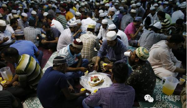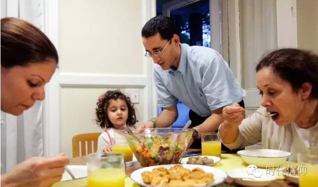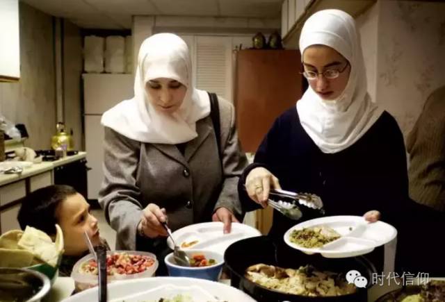 愛荷華州錫達拉皮滋的穆斯林一家人在清真寺享用齋月夜晚開齋宴。