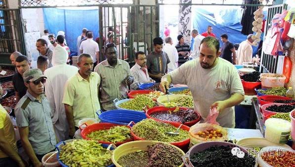 人們在利比亞首都的黎波里市中心的一個市場內購買橄欖和醃菜