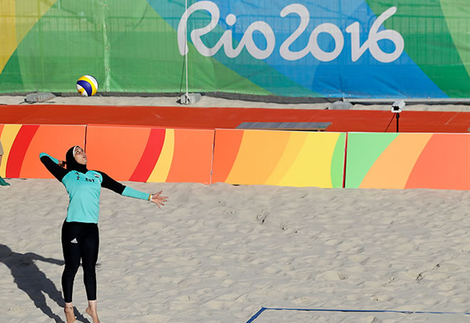 在當前正在進行的巴西裡約奧運中,一場戶外女子沙灘排球比賽場上,出現一名不同尋常比賽裝束的運動員,引起觀眾格外的注目。 一般的女排運動員身穿比基尼,幾乎全部赤身露體,而她卻掩蓋全身,只有手足和臉部露出皮膚。 她是來自埃及的美麗姑娘杜阿·戈巴希,今年20歲,頭戴蓋頭,身穿長袖運動服,參加比賽全過程。