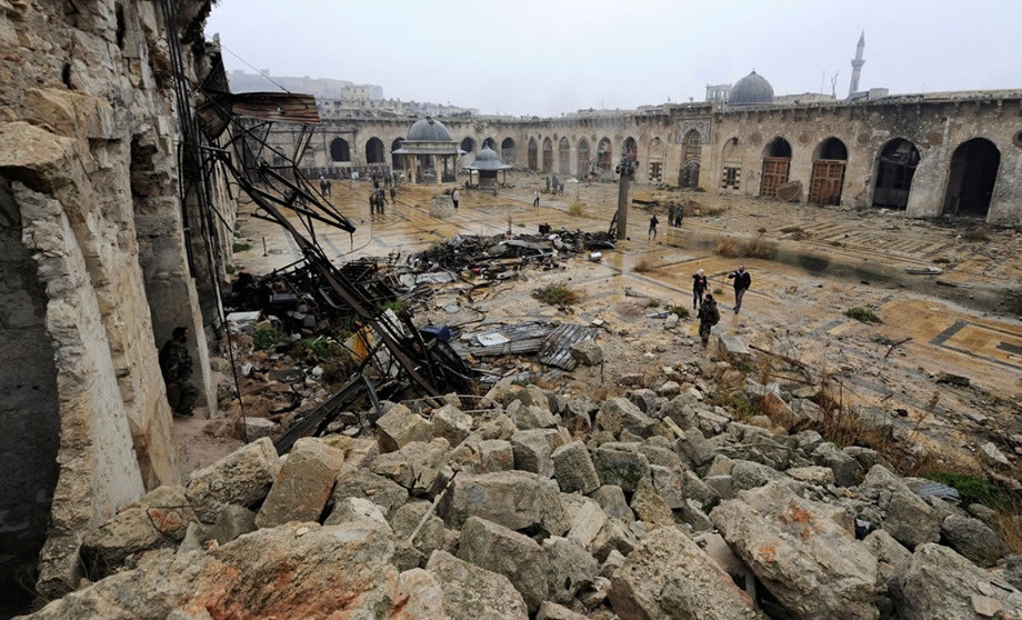 雙方惡戰首先反映在了古城記憶,2012年9月中旬,阿勒頗城堡週邊同列為世界遺產保存內容的「城市市場」(Al-Madina Souq)在交戰中被大火焚毀,600多年的商旅記憶就在烈焰中成為廢墟;之後,戰爭甚至打進了清真寺,中東地區最為著名的信仰地標,擁有1,200年歷史的阿勒頗大清真寺也在2013年4月被轟毀——寺內那根標誌性、紀錄著歷史更迭的叫拜塔,在戰爭中變成反抗軍狙擊手的制高點而遭到政府軍炮擊,千年記憶成為碎瓦竟不留一聲歎息。