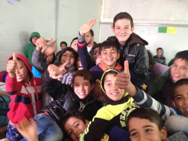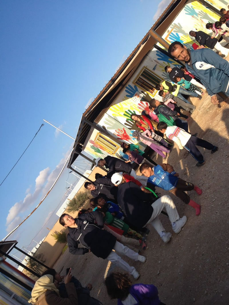 我們來到學校。孩子們興奮的高唱:“我們愛約旦,愛約旦的山愛約旦的樹,我們愛大馬士革,我們愛摩洛哥......”。封閉的難民營,充滿孩子們過節般的沸騰和孩子們戰爭摧毀不了的純真笑臉。戰爭奪去了他們的一切無家可回,他們卻仍執著地熱愛著阿拉伯這片土地。生活殘忍對待了他們,他們仍頑強的站著回報以熱情。於是我們明白了,以對待任何平常孩子的方式對待他們,才是給他們的最好尊重。於是,我們以他們快樂的方式回應他們的快樂。我曾設想用設計的臺詞鼓勵他們,卻不小心從孩子們那裡被給予滿滿的感動。如果寸草不生的荒漠令人不再有對未來的希望,那孩子們怒放的似錦童顏就是荒漠裡的綠洲清泉。