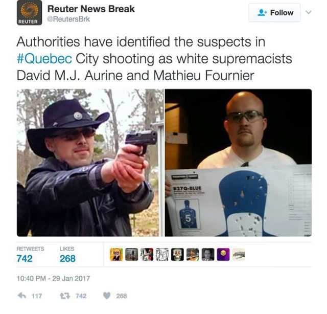 這個偽裝成路透社突發新聞的推特帳號發佈了一則“魁北克兇手被確認為兩名白人至上主義者”的假新聞。雖然這個帳號已經因為散佈虛假新聞被吊銷,但許多網友發現“每日野獸”這家新聞網站中了招,在文章中引用了這則假新聞中的假疑犯姓名。