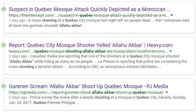 此類事件由於員警調查結果公佈前資訊較少,因此媒體的搶先報導通常嚴重依賴採訪平民,致使第一時間的報導經常出現偏差。這次也不例外,在事件發生過後,路透社便轉發了加拿大媒體的報導,稱嫌疑人開槍前曾大喊“Allahu Akbar(真主最偉大)”,並且其中一名是穆斯林國家摩洛哥人。這一消息始於加拿大廣播電臺採訪的一個匿名目擊者,在他的證言中還提到了兇手似乎有魁北克口音,但隨後轉發的媒體似乎都忽略了這個細節。福克斯新聞、各類右翼小報和網路媒體瞬間把握住這個機會,紛紛打出頭條:“高喊著真主最偉大襲擊魁北克清真寺的槍手被認定為摩洛哥人”。