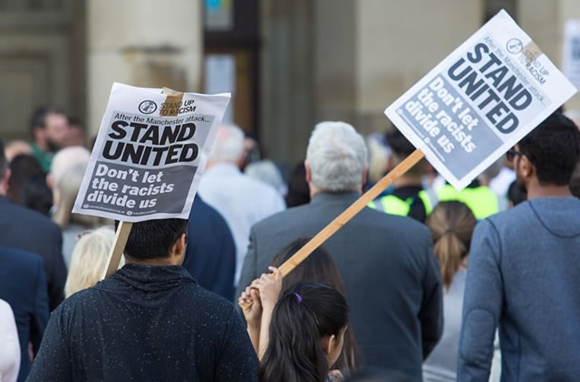 爆炸發生後,極右組織“保衛英國聯盟”(English Defence League)於第一時間在曼徹斯特地區發起了一系列反穆斯林活動,對於這種極端民族主義、種族主義行為,曼徹斯特人民作出了尖銳回應,曼徹斯特人民表示他們無法容忍這種行為的存在。