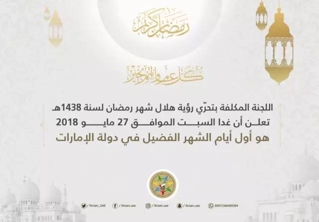 此外,阿聯酋、巴林、科威特、葉門、黎巴嫩在週四晚間未觀測到新月,在週五26日晚觀測到新月後宣佈:2017年5月27日星期六為伊曆1438年萊麥丹月第一天。