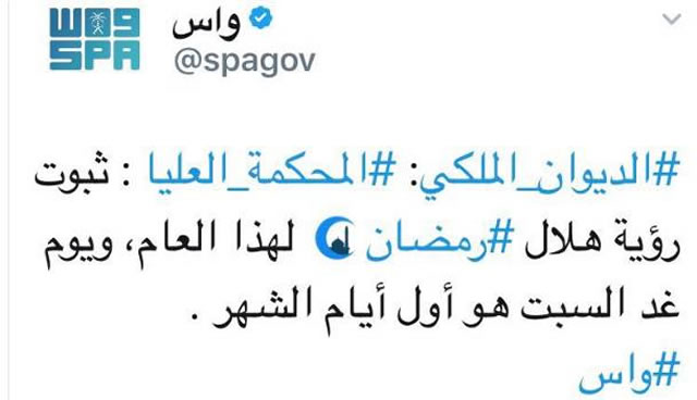沙特最高法院在5月25日未觀測到新月後,宣佈週五晚繼續觀測新月,並宣佈在5月26日晚觀測到新月。沙特最高法院宣佈: