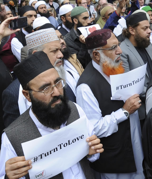 5月28日,“英國穆斯林論壇”成員與當地基督教、猶太教領袖們一起為5月22日曼徹斯特爆炸案遇難者默哀致敬。