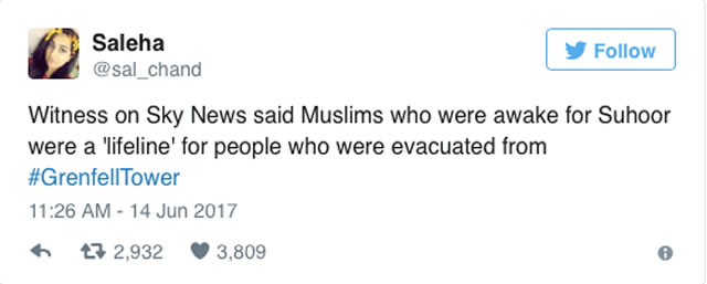 一位名叫薩勒哈(Saleha)的網友稱:“據《天空新聞》報導,目擊者稱,對於及時逃離大火的很多居民而言,他們的穆斯林鄰居就是救命恩人。”