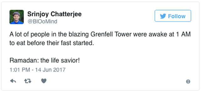 一位名為查特吉(Chatterjee)的居民發表推特稱:“大樓著火時,樓內很多居民還沒睡,他們在準備吃他們的封齋飯。齋月真是我們的大救星!”