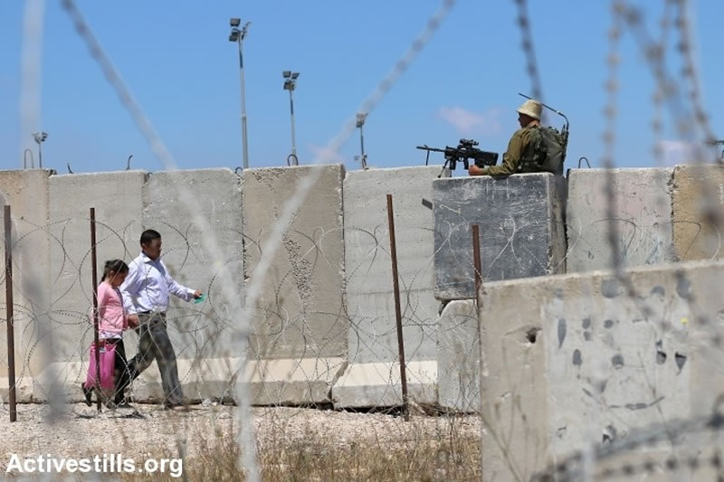 2017年6月21日,蓋蘭迪耶檢查站,以色列士兵將槍口對準前往耶路撒冷阿克薩清真寺參加“蓋德爾夜”的巴勒斯坦民眾,嚴陣以待。
