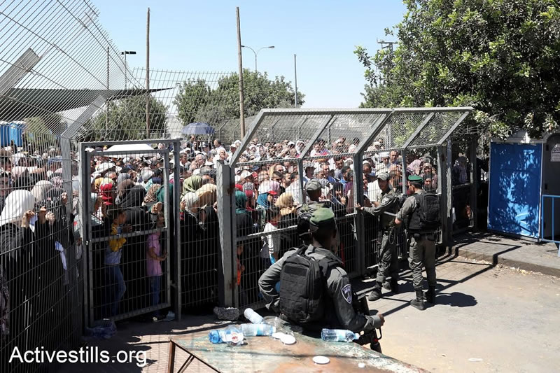 2017年6月9日,巴勒斯坦人聚集在蓋蘭迪耶檢查站隔離牆外等候檢查,排隊進入耶路撒冷參加本次齋月的第二個主麻聚禮,荷槍實彈的以色列軍警站在制高點嚴陣以待。