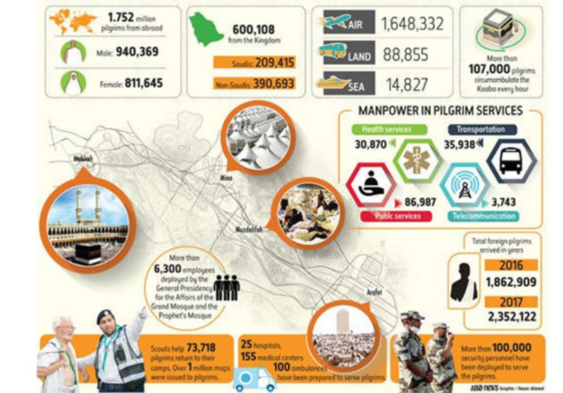 葉門慈善事務指導部長艾哈邁德·阿提亞博士給薩勒赫國王致電,代表全體葉門朝覲者向沙特政府表示感謝,今年參加朝覲的葉門穆斯林受到沙特政府熱情接待和關顧,全體成員安全無恙,沒有發生任何意外事故。 “今年的朝覲成功是沙特政府努力的成果,感謝全體官員和技術人員的不懈努力認真負責,也歸功於沙特政府通過各地仲介的密切配合,組織工作有條不紊,一絲不苟。” 奈及利亞朝覲事務局局長阿卜杜拉·穆罕默德在他的朝覲工作總結中說,2017年的朝覲偉大成功將載入史冊,尤其在今年朝覲人數有所增加的情況下,更加驗證了沙特政府的管理才能和工作效益,無與倫比,難以用語言形容。