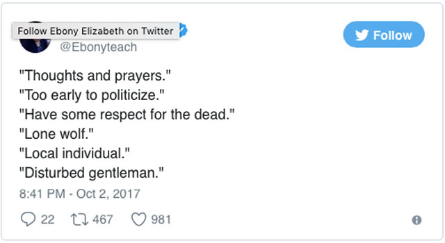 網友列出了此類槍擊事件中常見的反常且諷刺性語句:“祈禱,祝福”、“現在將這一事件政治化還為時尚早”、“敬重逝者”、“獨狼”、“當地平民”、“神經錯亂的紳士”……