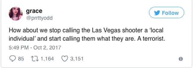 執法人員已經公佈了有關兇手史蒂芬•帕多克(Stephen Paddock)的大量個人資訊,但是,絕大多數媒體報導都在強調他只是一名“當地平民”,是“獨狼”。評論家指出,媒體運用這種報導方式,是為了強調兇手是一名白人,而非什麼恐怖分子。