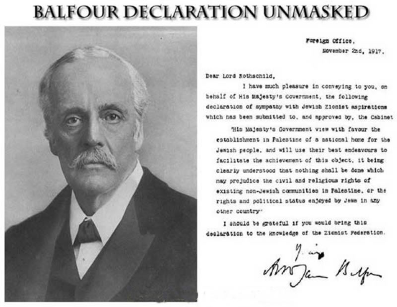 1917年11月2日,英國夥同猶太複國主義者單方面簽訂了《貝爾福宣言》,該宣言是英國政府支援猶太人掠取巴勒斯坦地區建立獨立民族國家的公開保證。