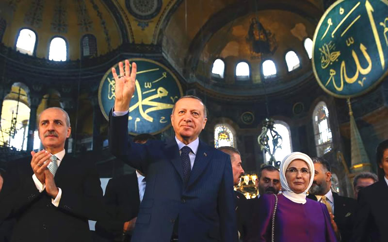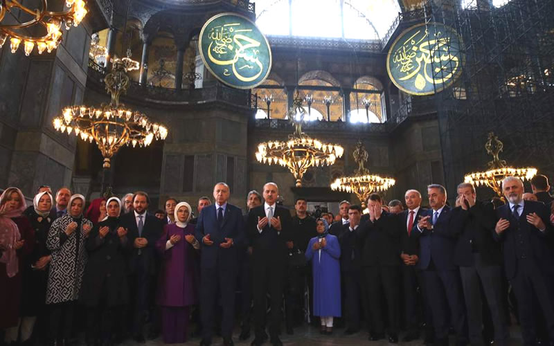 近日,土耳其總統埃爾多安前往位於伊斯坦布爾的聖索菲亞大教堂參加了一起藝術節開幕式,期間,埃爾多安總統誦讀了古蘭經開端章,並為征服伊斯坦布爾的奧斯曼先輩們做了祈禱。