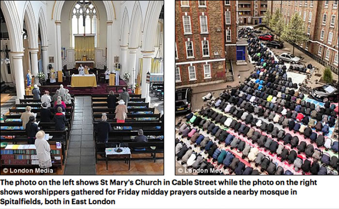 《每日郵報》曾發表倫敦市中心一座教堂與清真寺對比圖,兩座建築間隔只有幾米。這座名為聖喬治亞的教堂可容納1230人,可是,每週只有12人前來參加彌撒禮,隔壁的聖瑪麗亞教堂則有20人出席。而相隔不遠的東伯恩街清真寺卻面臨著另外一個難題——過於擁擠。該清真寺只能容納100多人,然而,週五聚禮時,清真寺根本無法容納前來禮拜的穆斯林,穆斯林群眾只得在清真寺門口、甚至街區禮拜。