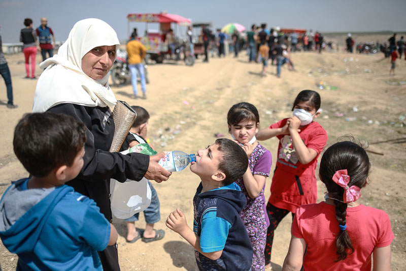 年長的婦女們在臨時搭建的帳篷旁邊烤制阿拉伯大餅,免費提供給遊行者。