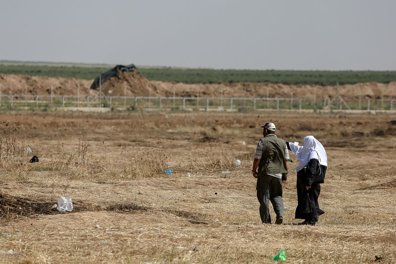 以色列政府在加沙地帶強行修建所謂“邊境隔離帶”。一對巴勒斯坦夫婦在“邊境”地區眺望對面的故土。