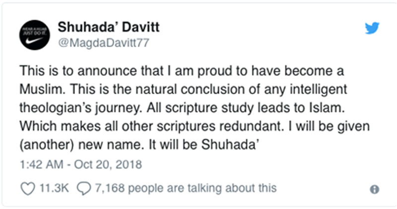 奧康娜在推文中表示:“我謹在這裡自豪地宣佈,我已成為一名穆斯林。對於任何有理解能力的宗教研究者而言,這是自然的歸宿。所有的經典都指向伊斯蘭,伊斯蘭的存在也讓其他經典倍顯多餘。如今的我,有一個新名字:舒哈達。”