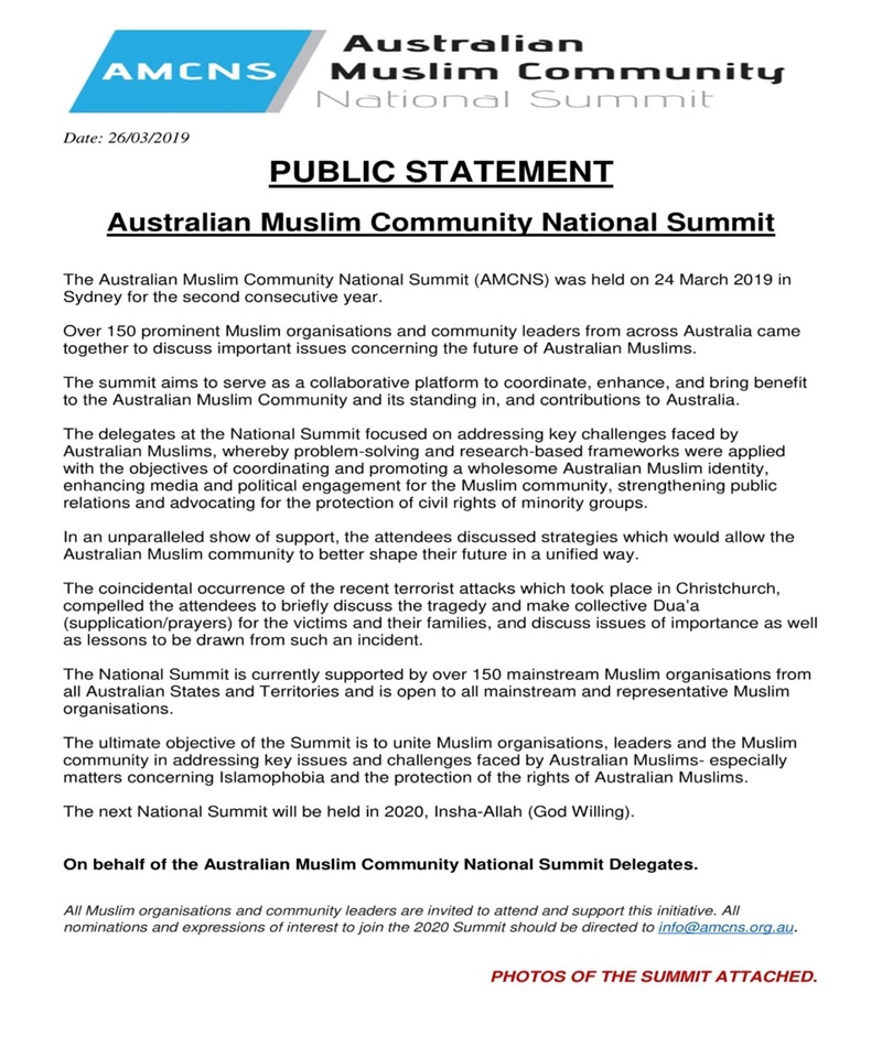 截至目前,已有逾150個澳大利亞主流穆斯林團體加入全國峰會,峰會依舊歡迎更多的穆斯林團體加入進來,共同為澳大利亞穆斯林乃至全世界穆斯林的福祉而奮鬥。