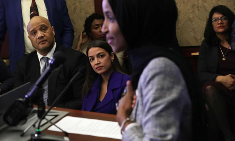 安德列•卡森(Andre Carson)、亞歷山大•奧凱西奧•科特茲(Alexandria Ocasio-Cortez)、萊希德•特萊布(Rashida Tlaib)議員等人仔細聆聽伊爾汗•奧馬爾議員在國會山首次開齋宴致辭