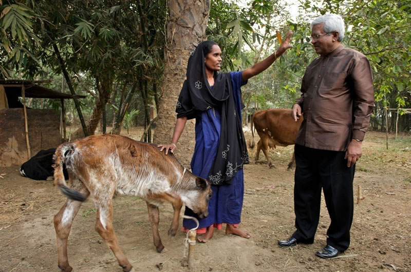 一名婦女向法茲勒爵士展示BRAC捐贈的小奶牛