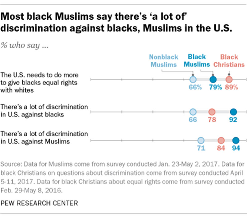 資料顯示,92%的黑人穆斯林認為他們因為黑人與穆斯林的雙重身份而受到歧視,在非黑人穆斯林群體中,該數據則為66%。此外,約79%的黑人穆斯林認為美國政府必須不斷調整政策並管控極端言論與暴行,從根本上保護黑人穆斯林群體的合法權益,進而做到不同種族間的平的與和諧。