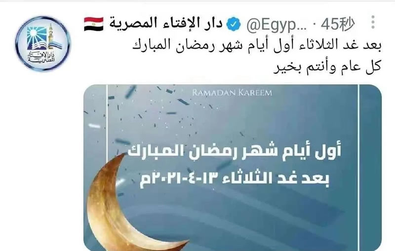 基於此,埃及教法機構宣佈,4月13日星期二為伊曆1442年萊麥丹齋月第一天。4月12日星期一為全美舍爾巴月的第30天。