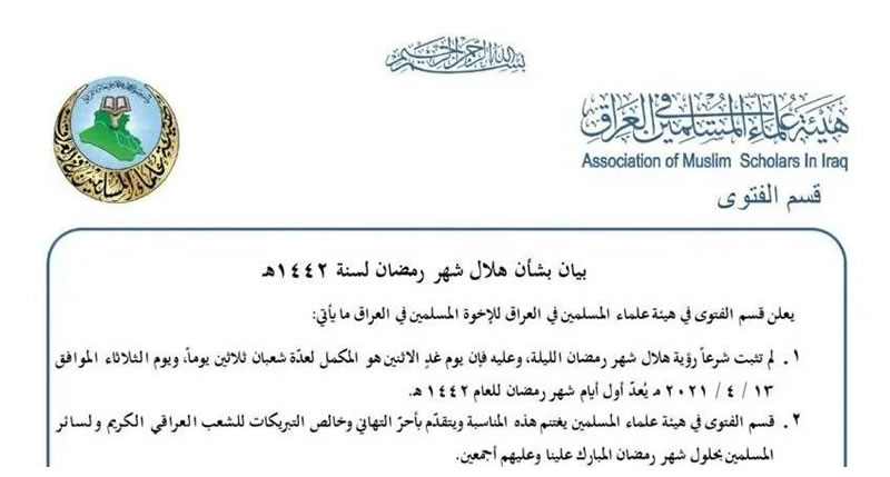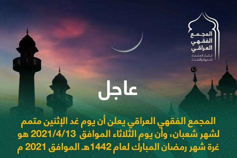伊拉克穆斯林學者機構、宣佈:4月12日星期一為伊曆舍爾巴月第三十天,4月13日星期二為伊曆1442年萊麥丹齋月第一天。