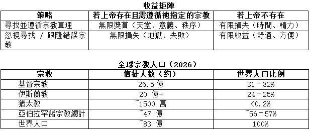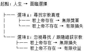 - 如果上帝不存在 → 有限損失(時間、精力)。