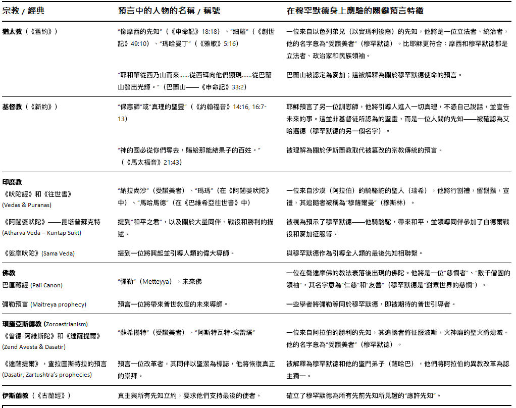 根据印度教、基督宗教、犹太教、佛教和琐罗亚斯德教的经典,先知穆罕默德是唯一被这些经典预言的人物。这些宗教传统的信徒合计超过全球人口的75%。如果多个独立的宗教都预示着他的到来,那么对于任何真诚寻求真理的人来说,以穆罕默德为最后使者的伊斯兰教,就应当被优先研究。 世界经典中的证据(比较预言表摘录)印度教《吠陀经》:《阿闼婆吠陀》中的昆塔普苏克特描述了一位“骑骆驼的圣人”和一位“和平之王”,被认定为穆罕默德。