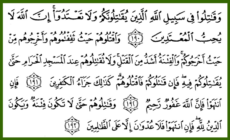 【《古蘭經》〔2:190~193〕】:“你們當為主道而抵抗進攻你們的人,你們不要過分,因為真主必定不喜愛過分者。你們在哪裡發現他們,就在哪裡殺戮他們;並將他們逐出境外,猶如他們從前驅逐你們一樣,迫害是比殺戮更殘酷的。你們不要在禁寺附近和他們戰鬥,直到他們在那裡進攻你們;如果他們進攻你們,你們就應當殺戮他們。不信道者的報酬是這樣的。如果他們停戰,那麼,真主確是至赦的,確是至慈的。你們當反抗他們,直到迫害消除,而宗教專為真主;如果他們停戰,那麼,除不義者外,你們絕不要侵犯任何人。”