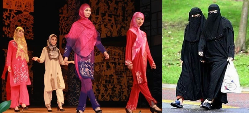 左圖為穿戴中國穆斯林傳統服飾的穆斯林,右圖為穿戴蒙面罩袍的穆斯林