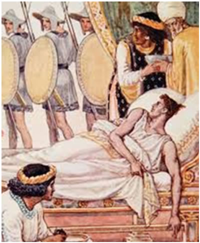 在大帝的行軍帳中,病床周圍都是他的文武官員,垂手待立,鴉雀無聲,只有嗚咽的哭泣,聽到君主最後遺囑,不可思議,也不敢做聲。其中一位他最貼身的將軍,上前親吻他的手,緊緊握住,大膽提問:“您聰明無比的陛下,饒恕我等下人無知,我們必然忠實執行您的命令,一絲不苟,但願陛下開示,這些都是為了什麼?”