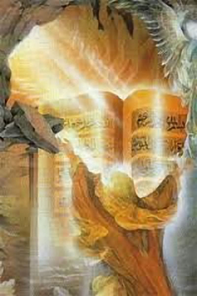巨大的衝擊伴隨著光芒第三次襲來,超越了他的承受能力,即將迫使他倒癱在地,又一句“讀吧”,聲音稍有清晰和低沉。 穆罕默德也相應平靜了一點,便大聲向空中發問:“要我讀什麼?” 這時,外部的壓力和體內的緊迫感都有些鬆弛,有了一些輕鬆和生的希望。 這個聲音說:“你應當奉你的創造主的名義而宣讀,他曾用血塊創造人。 你應當宣讀,你的主是最尊嚴的,他曾教人用筆寫字,他曾教人知道自己所不知道的東西。”(古蘭經,96:1 – 5)