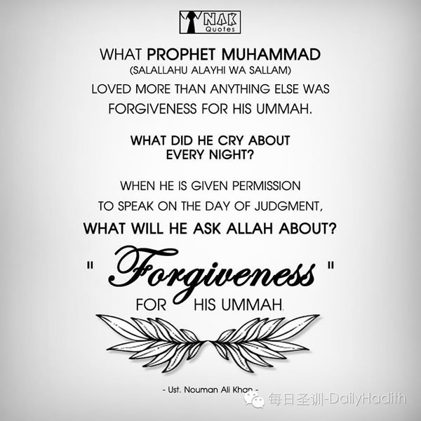 穆聖最喜愛的是為自己的穩麥求得寬恕 葉哈雅 2016-06-13 12:26:24 瀏覽 每一晚 他為何哭泣? 在審判日 當他有機會祈求時 他將祈求什麼? 是對他穩麥的寬恕 BY 努爾曼•阿裡•汗 -------------------------------------- 不要在你封齋時讓人惹惱你、激怒你,要守護你的齋戒,時刻都要警醒自己,萊麥丹月的考驗是層出不窮的。 BY 穆夫提•蒙克 (DH編譯)