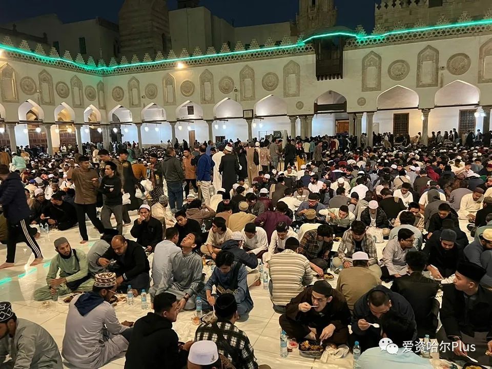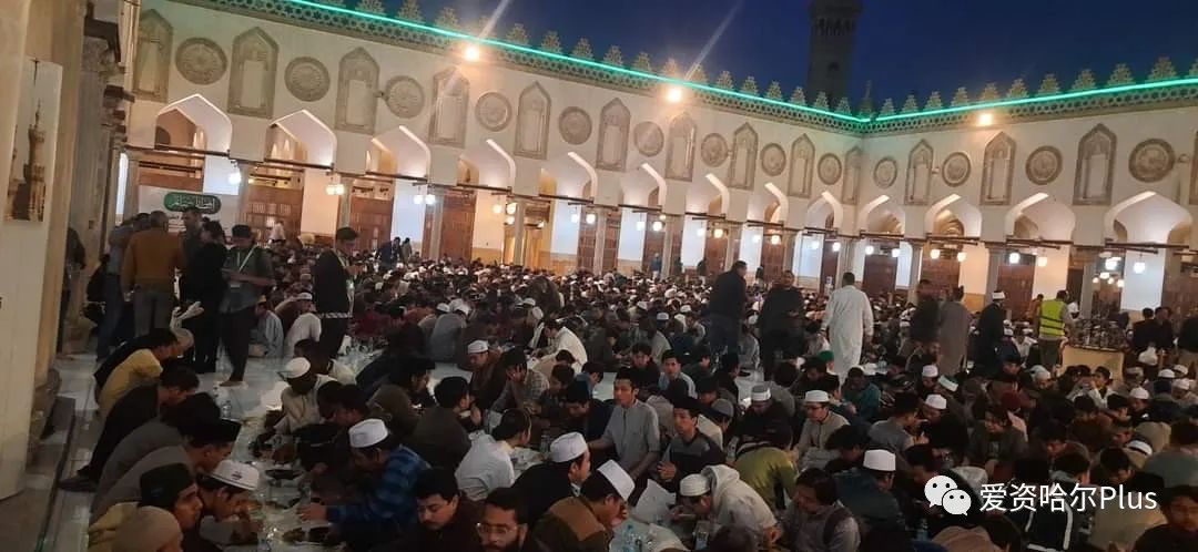 這是在埃及愛資哈爾清真寺庭院中為外國留學生準備的集體開齋筵