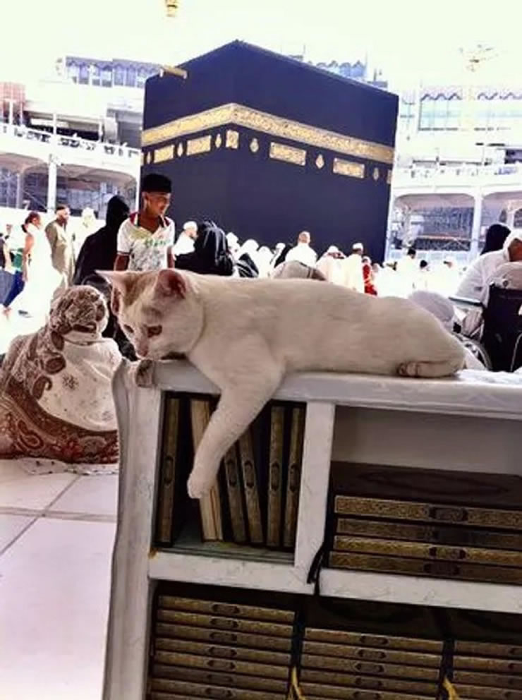 麥加禁寺的貓。一隻貓可以在伊斯蘭最神聖的天房附近活動,這也反映了先知穆罕默德(願主福安之)的穩麥對貓的喜愛。