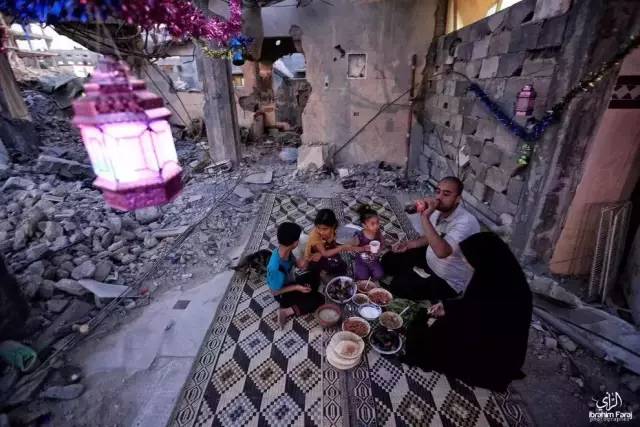 一個巴勒斯坦的家庭正在加沙市破爛的廢墟中享用黎明前的封齋飯。