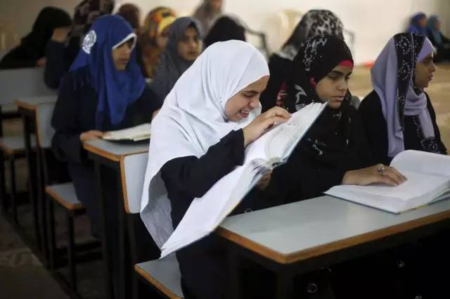 在齋月首日,失明及視障的巴勒斯坦女童,在加沙市「古蘭經之家」(Dar al-Qur'an)的中心參加古蘭經誦讀班上課時,查閱凸版刻製的古蘭經。成千上萬的巴勒斯坦穆斯林,包括失明或視障的學生,參加「古蘭經之家」主辦的學習班,學習正確的古蘭經誦讀法,並將整本古蘭經全背。