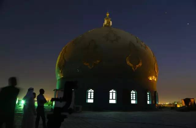 黃昏時,伊拉克穆斯林在巴士拉的伊瑪目阿里清真寺屋頂上等候尋看標誌萊買丹到臨的新月。