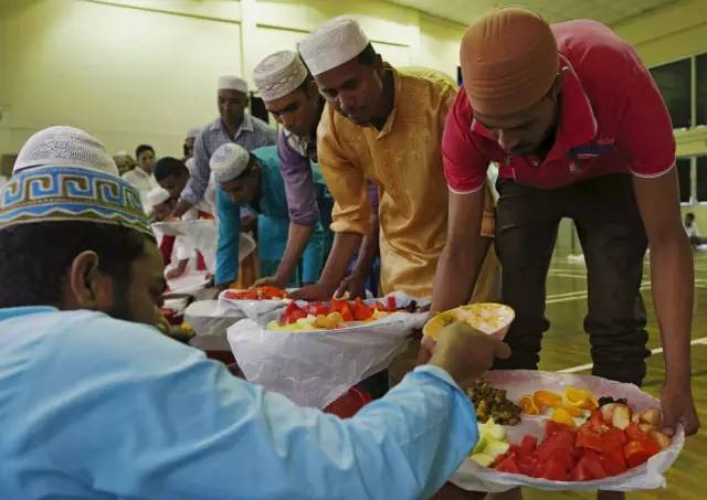 孟加拉籍的工人在他們宿舍附近的一間清真寺內準備開齋茶點。