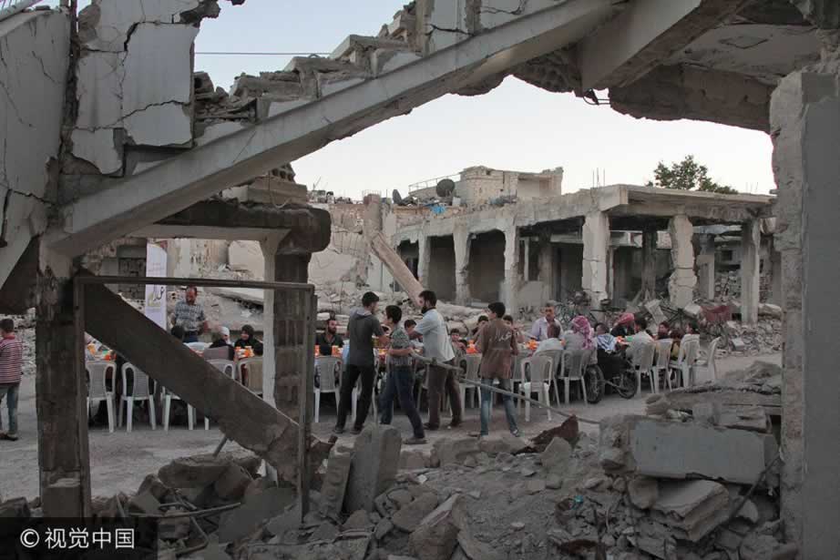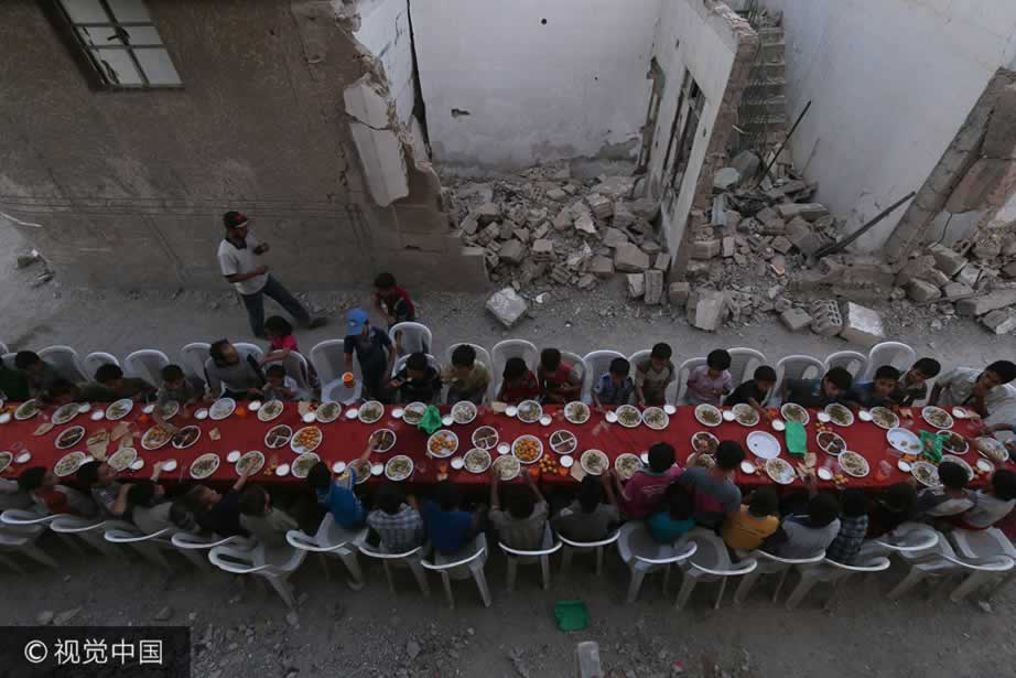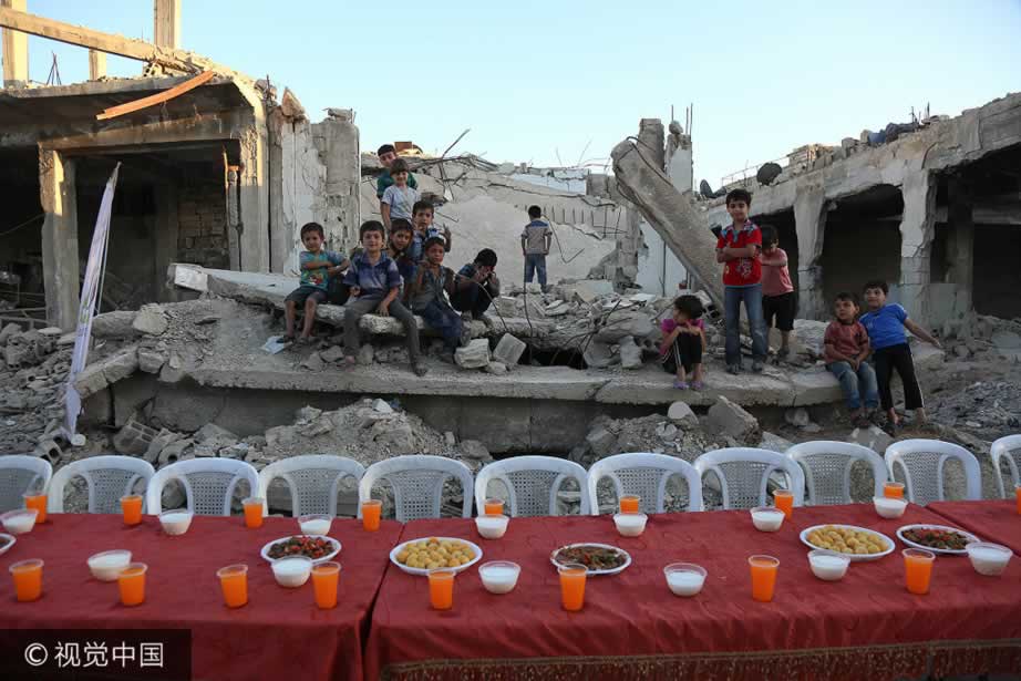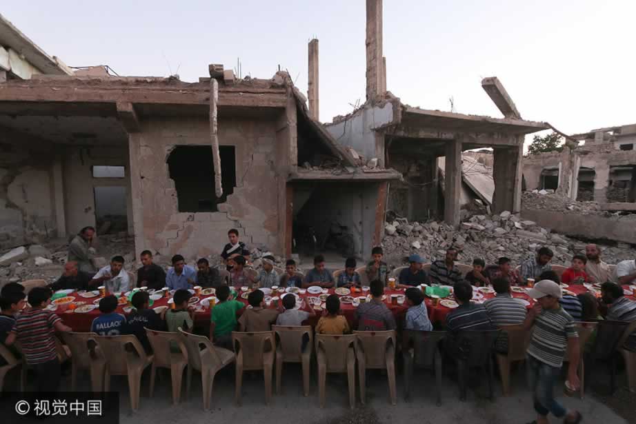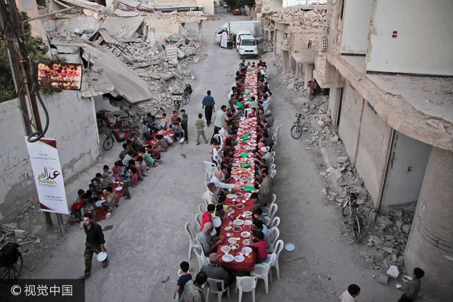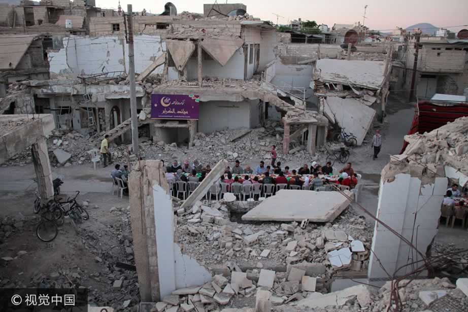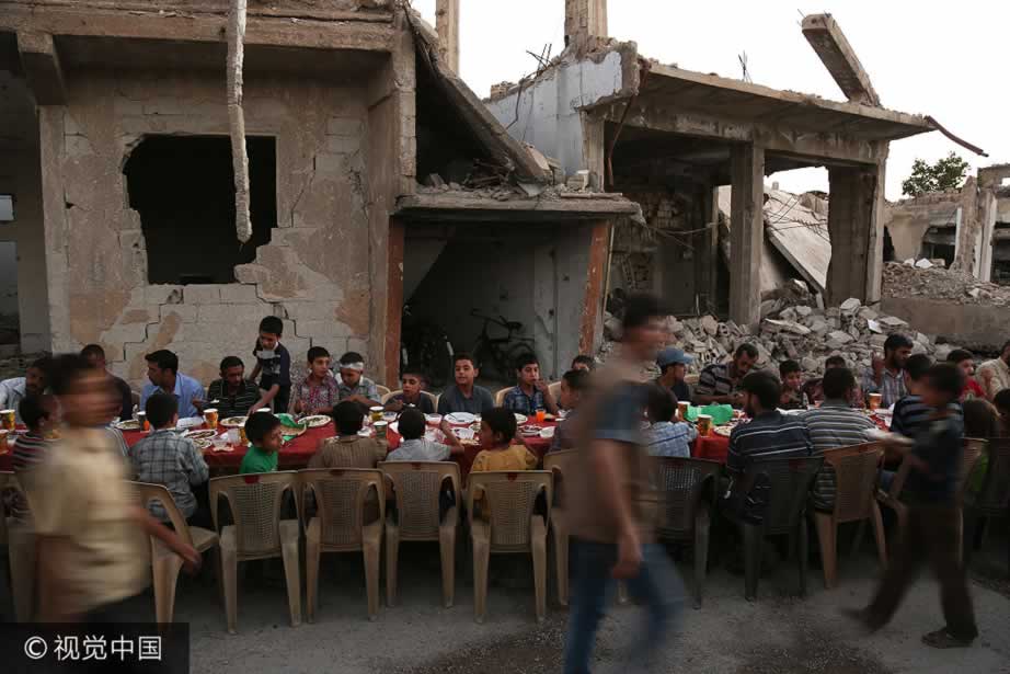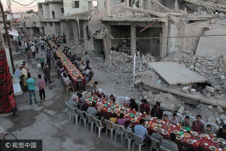 日,敘利亞杜馬,當地穆斯林在廢墟中擺起長桌,享用開齋飯。
