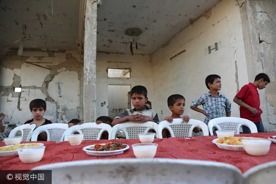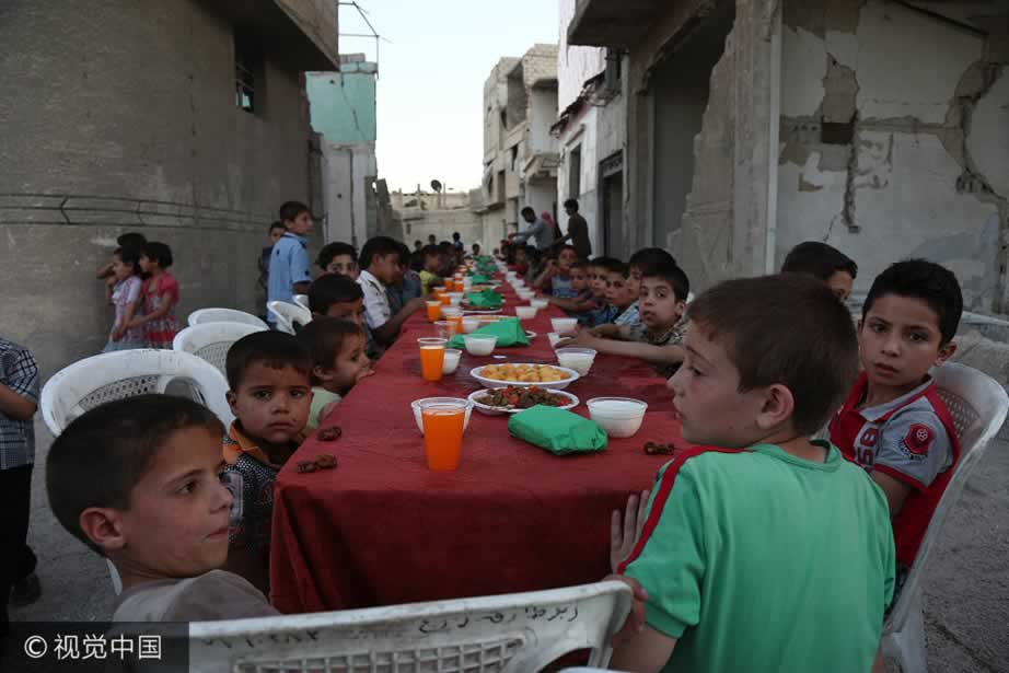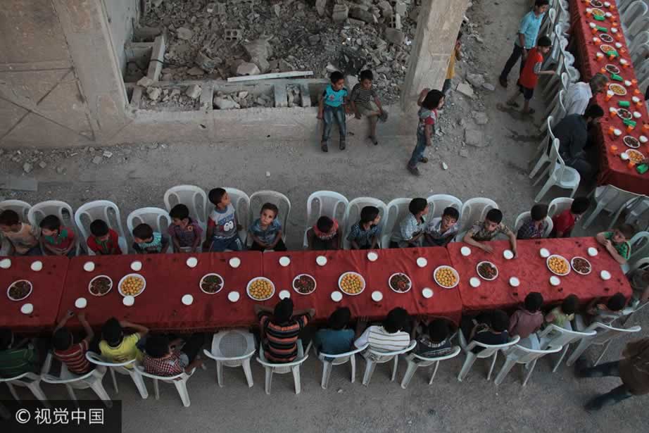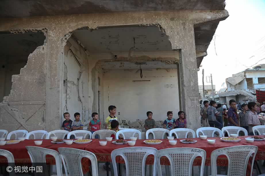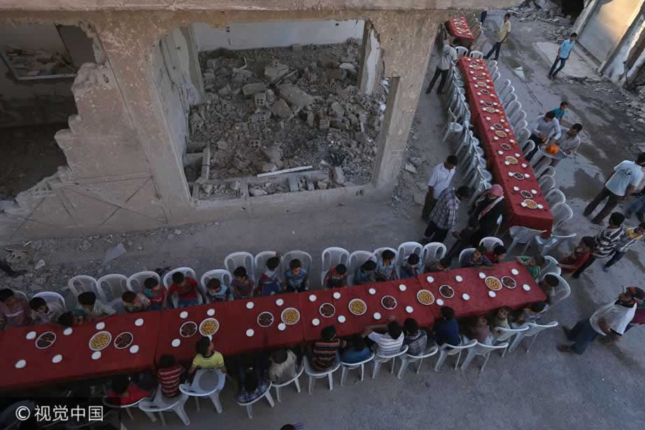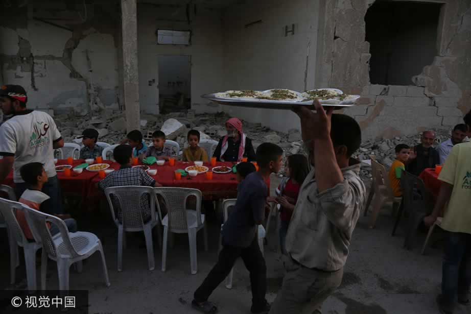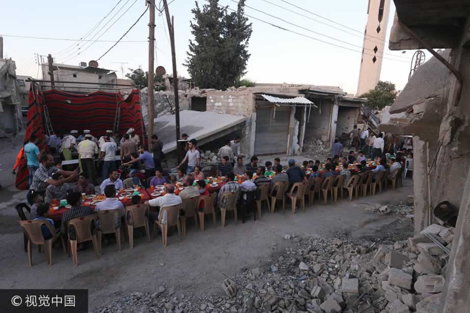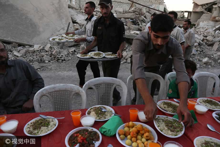 日,敘利亞杜馬,當地穆斯林在廢墟中擺起長桌,享用開齋飯。
