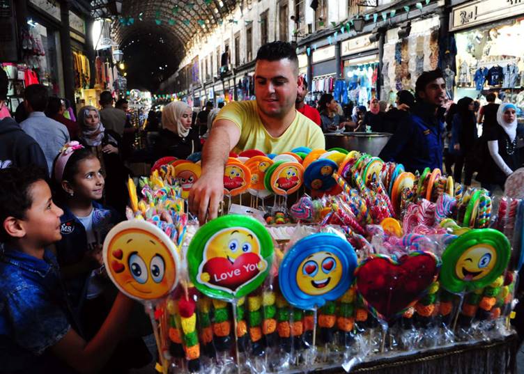大馬士革舊城,暫時忘卻戰爭之痛的孩童購買棒棒糖,笑容滿面。