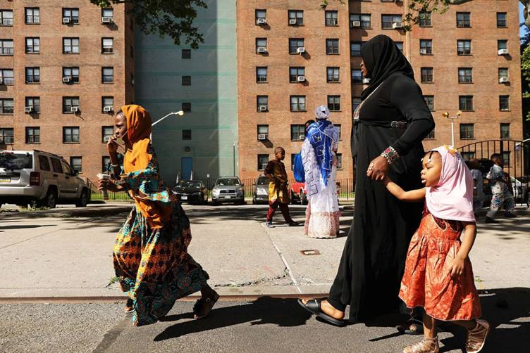 紐約地區非裔美國穆斯林聚居區,婦女攜兒帶女趕赴開齋節會禮。